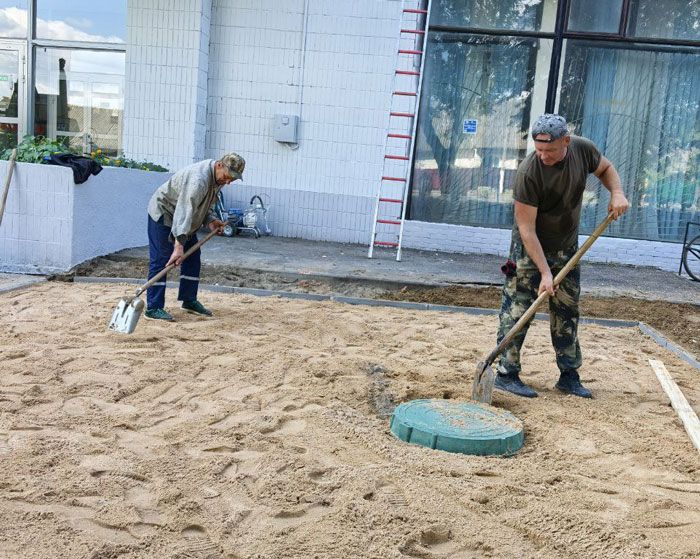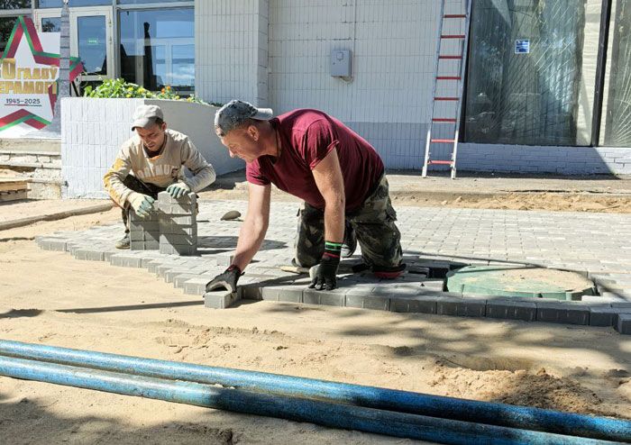 Также работники Вилейского ЖКХ занимаются укладкой тротуарной плитки возле завода «Зенит».