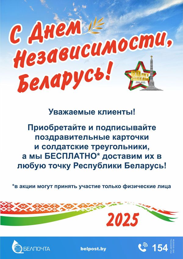 «Белпочта» 3 июля проведет акцию «Поздравь родных и близких с Днем Независимости»: бесплатно доставит по Беларуси простые почтовые карточки и солдатские треугольники, приобретенные участниками акции в местах проведения.