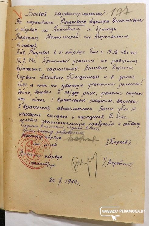 Праз некалькі гадзін малады жарэбчык давёз хлопца, узброенага пяццю карабінамі, у Навасёлкі да яго старэйшай сястры Манькі. Ды яшчэ са свежыной у возе. Не выкідаць жа яе было. Хай ўжо даруе той чалавек, што гэтак сталася. У тую ж ноч дзядзь­ка Адолец разам са сваім сябрам Лёшкам і тым заблукалым габрэем, ужо цалкам узброеныя трафейнымі карабінамі, на тым жа паліцэйскім жарабку з’ехалі ў партызанскі атрад імя Катоўскага партызанскай брыгады «Народныя мсціўцы» імя Варанянскага. Вось такім чынам мой дзядзька здабыў зброю для барацьбы з акупантамі не толькі для сябе і для свайго сябра, а і для габрэя з Радашковічаў, прозвішча якога ўжо сцёрлася з памяці.