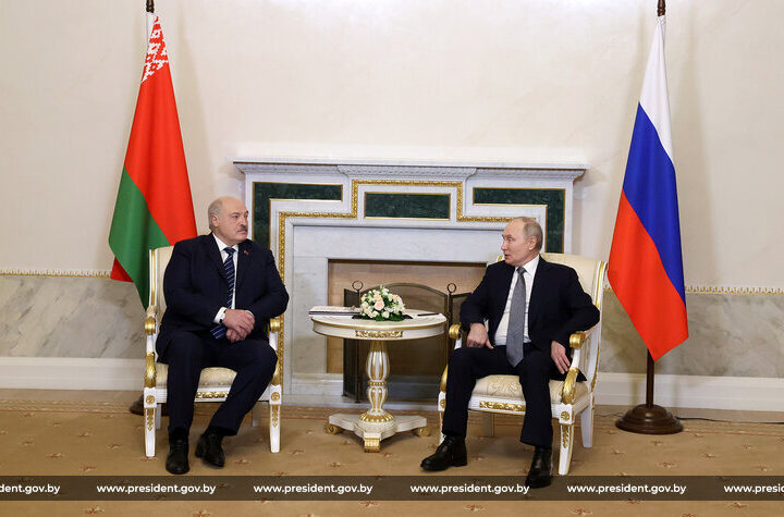 Президенты Беларуси и России Александр Лукашенко и Владимир Путин во время общения и переговоров...