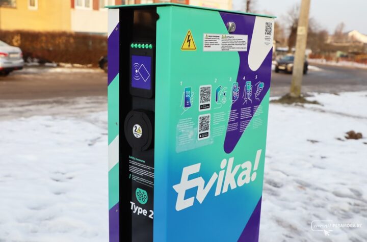 Электрозарядная станция Evika! от РУП «Белтелеком», установленная в Вилейке по улице 17 Сентября, 29А...