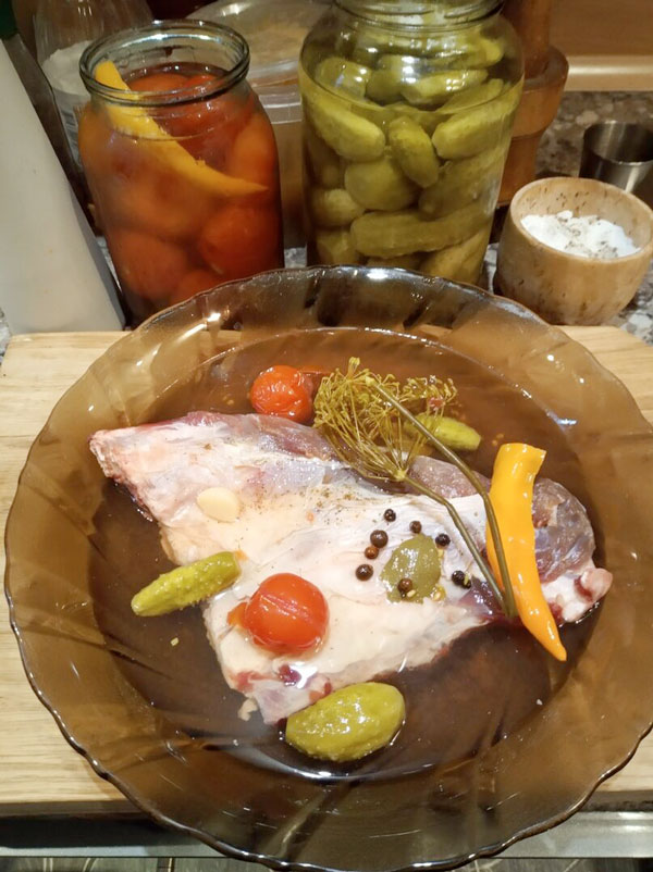Таким образом, я случайно открыл способ мариновки мяса в огуречном рассоле. С тех пор нет-нет да и замариную, что-нибудь этакое вкусненькое в рассоле, тем более, что жена ставит закатки на любой вкус и цвет – там и огурчики, и помидоры, перцы, лук чеснок и кабачок, а еще укроп и хрен… И этот свой рецепт я назвал “Райпо”.
