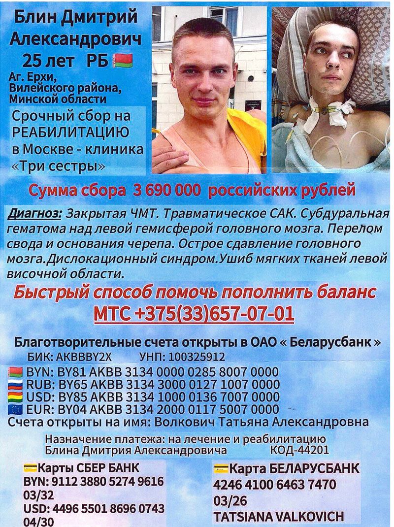 Дима долгое время пробыл в коме, потерял способность двигаться и разговаривать. Ему потребуется длительное дорогостоящее лечение и реабилитация. В Беларусбанке открыт благотворительный счёт для сбора средств. Очень прошу Вас, если есть такая возможность, помочь моему сыну встать на ноги, потому что мы не сможем сами материально справиться.