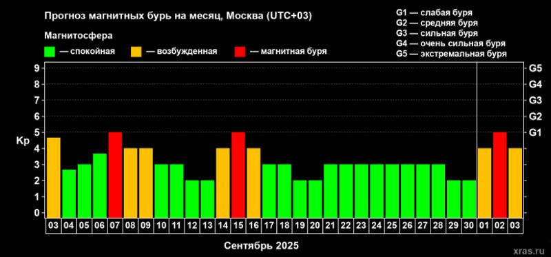 Согласно данным специалистов, 3 сентября геомагнитная обстановка будет находиться в неспокойном состоянии. А уже 7 сентября ожидается слабая магнитная буря уровня G1, последствия которой будут ощущаться еще два дня.