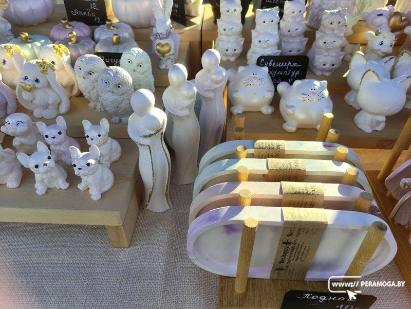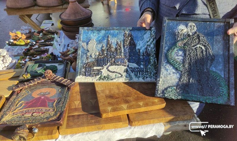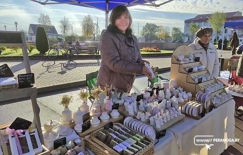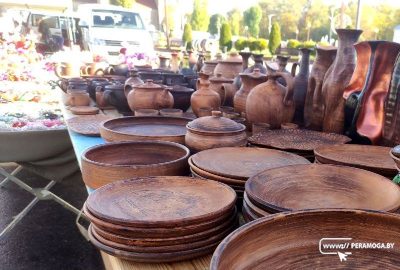 На ярмарку также съехались ремесленники, у которых накануне Дня матери можно было приобрести пряники с тематическими рисунками, ароматные свечи, фигурки, самодельные куклы и многое другое. С богатым ассортиментом приехала и мастерица из Минска. Два стола были уставлены самодельными изделиями из глины: тарелками, кружками, интересной формы кувшинами и другими предметами. «Гончарным делом я занимаюсь уже шесть лет. В работе люблю тишину и погружение в свое дело», – рассказала женщина. Она добавила, что в творчестве перепробовала многое: рисовала, а еще создавала на стекле уникальные композиции из бумаги.