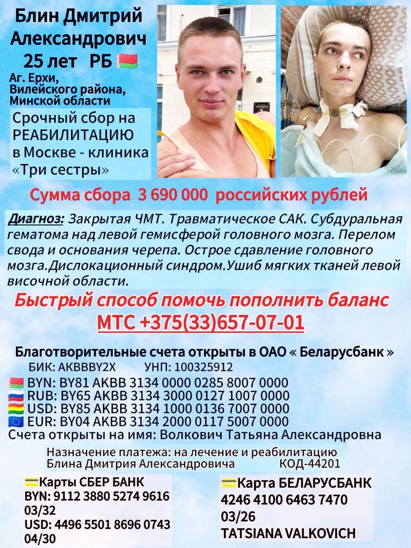 Дима долгое время пробыл в коме, сейчас у него работают только глаза. Ему потребуется длительное дорогостоящее лечение и реабилитация. В Беларусбанке открыт благотворительный счёт для сбора средств. Очень прошу Вас, если есть такая возможность, помочь моему брату встать на ноги, потому что мы не сможем сами материально справиться.
