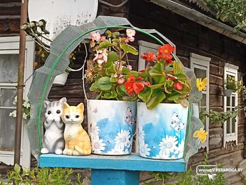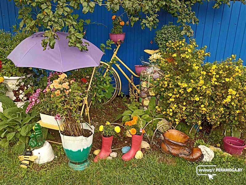 Акцэнтнымі дэталямі тут выступаюць парасоны ружовага, фіялетавага і блакітнага колераў, пад якімі «схаваліся» адмысловыя тэматычныя кампазіцыі са стракатымі кветкамі. Прыгажуні-вяргіні, хрызантэмы, тагецісы і пятуніі, разнастайныя дэкаратыўныя расліны ўдала суседнічаюць паміж сабой. Веласіпед з багатай гісторыяй таксама частка экспазіцыі: пафарбаваны ў жоўты колер, ён аздоблены кашпо з кветкамі. Кветкі расцвілі нават ў гумовых чырвоных боціках – так адна з творчых ідэй гаспадароў увасобілася ў жыццё. Аўтамабільныя шыны тут таксама – дэкор, аснова для кампазіцыі. Ёсць і сухі басейн для гіпсавага лебедзя.