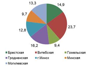 Удельный вес областей и г.Минска в объеме промышленного производства текстильных изделий,