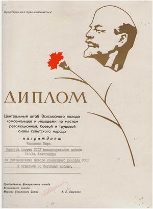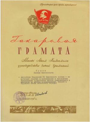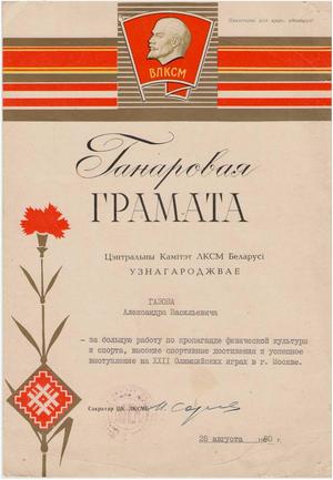 За выніковы ўдзел у 22 алімпійскіх гульняў у Маскве ўзнагароджаны ганаровай граматай ЦК ЛКСМБ.
