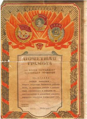 Вось яшчэ адна цікавая камсамольская ўзнагарода падпісана маршалам Баграмянам.