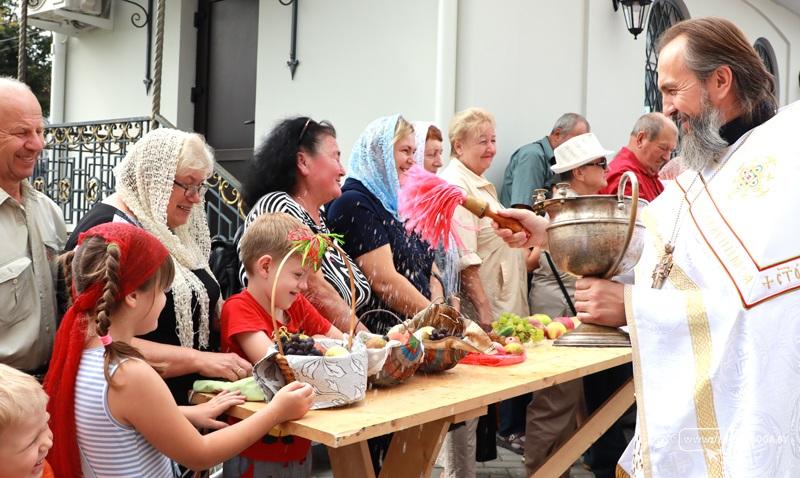 «Я прошу вас, дорогие мои верующие, на православные праздники в интернете никогда не отправляйте открытки. Лучше – поздравьте своими словами, напишите: «С праздником Преображения Господня»… И зайдите в храм, поблагодарите Бога – преклоните колени у иконы и скажите: Господи благодарю тебя, что жива, здорова, что все хорошо у меня… и вот какие яблочки выросли, чтобы в здравии покушать…», – сказал отец Вячеслав, а потом спросил у присутствующих, пойдут ли они в храм. И все хором ответили: «Да!».