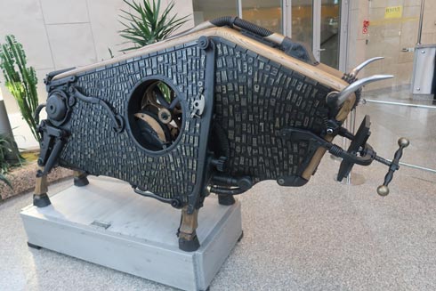 Материалом для нее стали детали старых печатных станков и типографского шрифта, что делает скульптуру памятником книгопечатанию и литературе в прямом и переносном смыслах. Среди букв алфавита, украшающих скульптуру, встречаются наши особенные «ў» и «і». Этот факт окончательно снимает вопрос о национальной принадлежности книжного зубра.