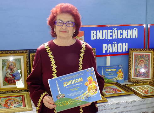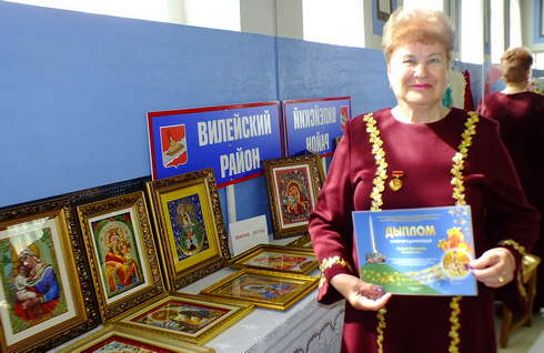 В рамках Республиканского фестиваля народного творчества ветеранских коллективов «Не стареют душой ветераны» члены клуба «Ветеран» получили возможность показать на областном празднике своё мастерство, приняв участие в выставке декоративно-прикладного искусства. В этом году Вилейский район удивил жителей г. Смолевичи непревзойдёнными работами талантливой Марии Легуш. Девять работ, вышитые бисером иконы, не оставляли зрителей равнодушными. Мария Дмитриевна – очень удивительный, добродушный, отзывчивый, творческий человек и профессиональный экскурсовод. От всей души хочется поблагодарить её за предоставленные работы. Спасибо Вам огромное! Очень гордимся, что у нас есть такие талантливые люди.