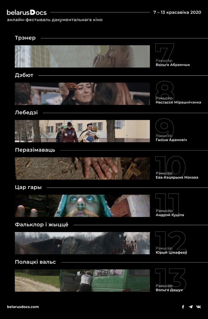 За неделю у любителей кино будет возможность, не выходя из дома, увидеть семь актуальных фильмов семи белорусских авторов. Каждый из фильмов фестиваля будет доступен для онлайн-просмотра в течение 24 часов с английскими субтитрами на сайте belarusdocs.com.