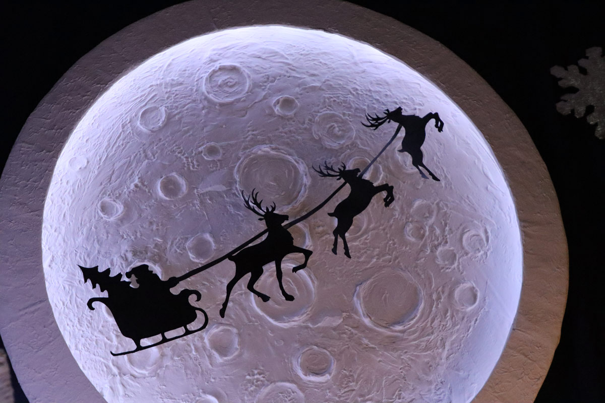 Здесь можно увидеть две фотозоны – новогодний камин с подсветкой, а в другом помещении развернулась настоящая сказочная фотозона: возле украшенной елочки расположился волшебный северный олень, а сверху – огромная Луна с подсветкой.
