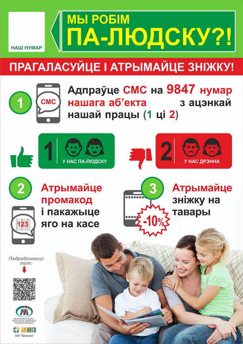 Каждому торговому объекту, который принимает участие в соревновании, присвоен номер для SMS-голосования, его можно найти на информационном плакате на торговом объекте – вилейский магазин под номером 126. Вместе с тем каждый участник голосования получает промокод, дающий скидку в 10% на товары сети ОАО «Белкнига».