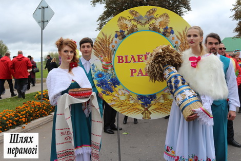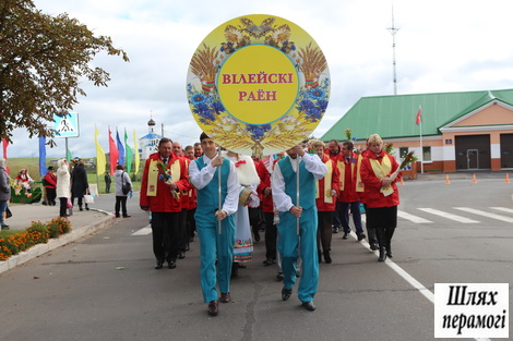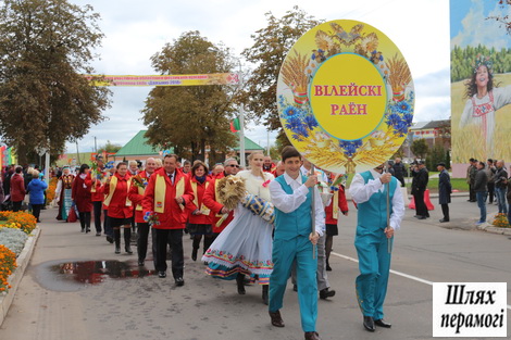 Традыцыйна асноўная частка фестывалю працаўнікоў вёскі «Дажынкі-2018» пачалася са святочнага шэсця калон «Шлях да хлеба», у якой ішлі кіраўнікі раёнаў і хлебаробы-перадавікі, а таксама лепшыя песенныя і харэаграфічныя калектывы рэгіёну. Кожны паказваў сваю выдумку і фантазію, у імправізаванай форме дэманструючы самыя незвычайныя вобразы на тэму жніва і ўраджаю: гарманіст на капе снапоў, жнеі з пудовымі караваямі, дзяўчаты ў касцюмах з каласоў і прычоскамі па паўметры ўвышыню, атрад жанчын з граблямі, як у знакамітай кінастужцы «Вяселле ў Малінаўцы», самаходная печ з вялікай дзяжой і кухарам-каравайнікам. Усяго не пералічыць, бо тут, як кажуць, і сеялі, і жалі, і на дудзе гралі. Віляйчане таксама здзівілі, як саміх гаспадароў, так і ўсе раёны вобласці, акрамя яскравай калоны перадавікоў у чырвоных куртках пад колер вілейскага сцягу з сімвалічнымі снапамі, якую ўзначальвалі старшыня райвыканкама Віктар Кот, старшыня раённага Савета дэпутатаў Алена Чабатар і кіраўнік сельгаспрадпрыемства – пераможцы раённага спаборніцтва – ААТ «Нарачанскія зоры» Генадзь Кучко. Незвычайнай і адметнай асаблівасцю вілейскага шэсця стаў вялікі конь з бульбы ў суправаджэнні цыганоў. Тут жа ішлі Народны хор «Любанія» з вялікім сцягам раёна, сімвалічныя дзяўчаты-жнеі, гурт «Весялінка», «Велея казацкая» і іншыя.