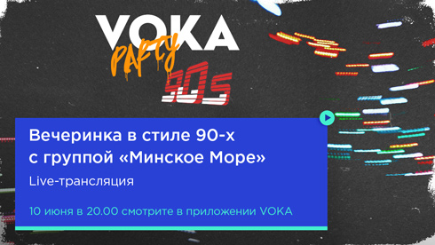 Новый формат летних концертов и вечеринок в режиме онлайн на VOKA продолжается: на этот раз петь и танцевать под лучшие хиты 90-х гости VOKA Party смогут вместе с кавер-группой «Минское Море».
