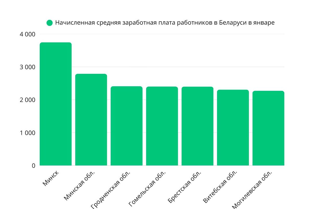 Самая высокая средняя заработная плата зафиксирована в Минске — 3747,8 бел. руб. В Минской области она составила 2789,3 бел. руб., Гродненской — 2411,4 бел. руб., Гомельской — 2400,8 бел. руб., Брестской — 2399,6 бел. руб., Витебской — 2307,1 бел. руб. и Могилевской — 2271,9 бел. руб.