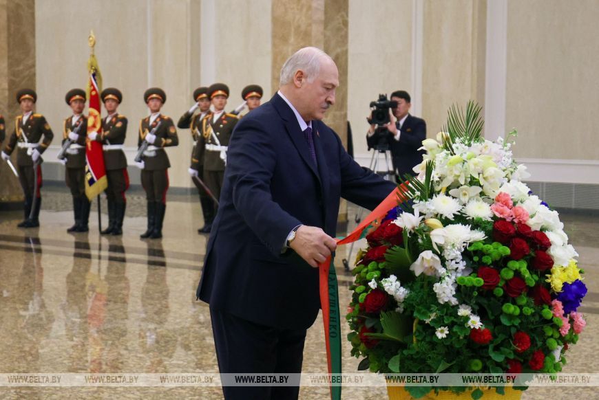 Президент Беларуси Александр Лукашенко в Пхеньяне посетил Кымсусанский дворец Солнца и почтил память руководителей КНДР Ким Ир Сена и Ким Чен Ира, передает корреспондент БЕЛТА.