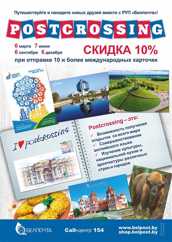 Postcrossing (посткроссинг) — популярный международный online-проект по обмену почтовыми карточками и марками, хобби, которое объединяет людей из разных уголков планеты. Беларусь вступила в движение посткроссинга в 2008 году. С тех пор тысячи открыток ежедневно разлетаются из нашей страны по всему миру. Ведь электронное письмо никогда не сравнится с яркой открыткой и посланием, написанным от руки.