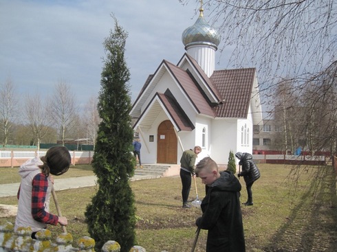 Свою лепту в наведение порядка на территории, прилегающей к храму в честь святой Анны в деревне Лыцевичи, внёс и волонтерский отряд «Мы – рядом» Чурлёнского УПК детского сада – средней школы. Ребята провели трудовую акцию по благоустройству и тем самым приобщились к большой республиканской акции. Надо отметить, что таких примеров множество, и практически во всех учреждениях образования проходили либо запланированы подобные акции. Активно работали ребята из волонтерского отряда “Открытое сердце” Долгиновской средней школы, которые благоустроили территорию возле часовни Рождества Иоанна Предтечи в д. Мильча. А активисты волонтерского отряда ”Милосердие” средней школы №1 потрудились на военных захоронениях на городском кладбище по ул. 1 Мая. Они уже многие годы являются главными смотрителями за могилами героев Великой Отечественной войны.