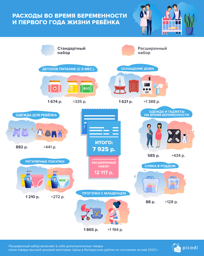 Аналитики Picodi.com подсчитали, сколько могут составить траты, связанные с появлением ребёнка: набор одежды во время беременности, сумка в роддом, оснащение дома при подготовке к появлению новорождённого и его содержание в течение первого года жизни.