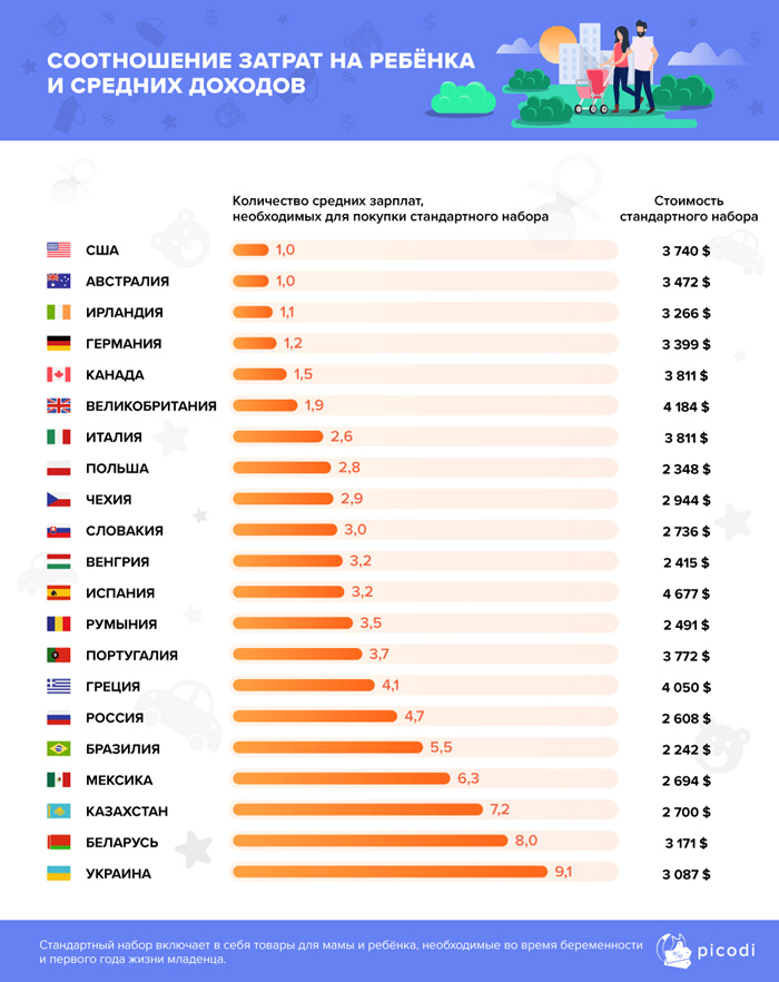Для сравнения, в Германии соотношение базового набора к средней оплате труда равно 1,2 заработной платы, в соседних России и Польше — 4,7 и 2,8 зарплаты соответственно. В Украине ситуация иная — 9 среднемесячных зарплат.