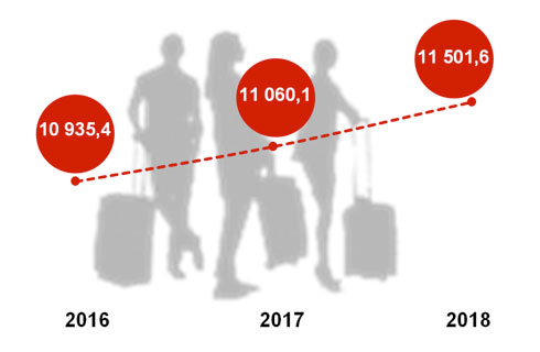 Въездной туристический поток в Республику Беларусь с учетом пересечений Государственной границы Республики Беларусь на открытом белорусско-российском участке в 2018 году составил 11,5 миллиона прибытий иностранных граждан.