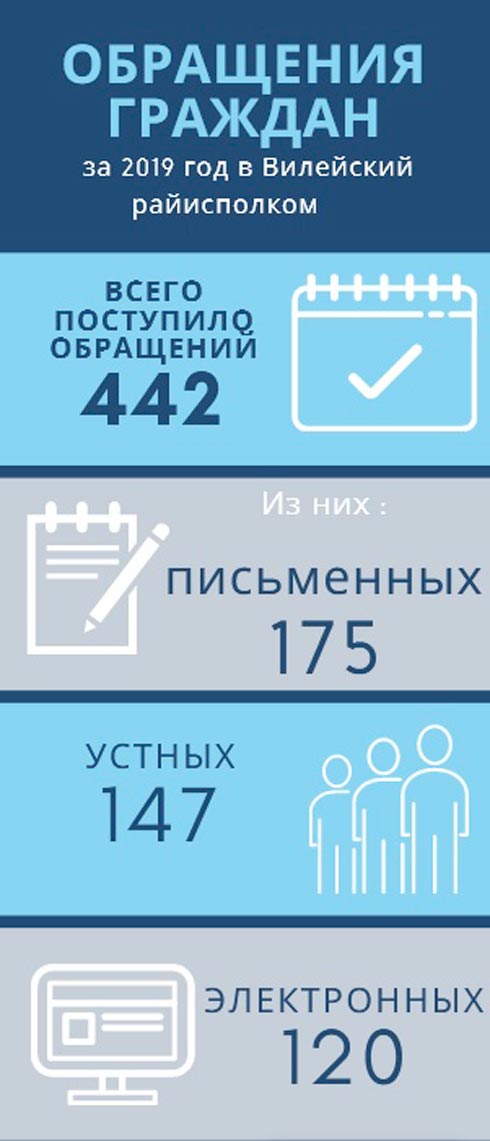 Так, за 2019 год в райисполком поступило 442 обращения граждан и представителей юридических лиц, из них 175 письменных, 147 устных, 120 электронных. Если сравнивать, в 2018 году поступило 410 обращений в райисполком.