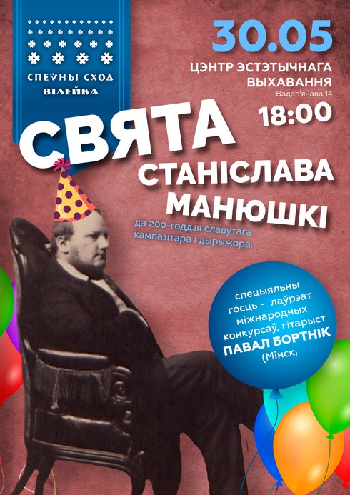 30 мая ў чацвер, у 18.00 у Цэнтры эстэтычнага выхавання адбудзецца канцэрт і спеўны сход у гонар Станіслава Манюшкі. Адзначаць угодкі такой вялікай постаці ў беларускай музыцы варта разам ды дакладна з песняй! Да нас завітае гітарыст Павал Бортнік, лаўрэат міжнародных конкурсаў, які выступіць з творамі Станіслава Манюшкі. Мы таксама паслухаем і нават праспяваем песні кампазітара, напісаныя для оперы на словы Яна Чачота. Спяваць Манюшку вельмі проста! Кожны жадаючы, з любым узроўнем музычнай падрыхтоўкі, можа прыйсці і пачаць спяваць разам.