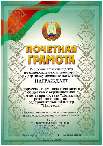 13 февраля Детский реабилитационно-оздоровительный центр «Надежда» был награждён Почётной грамотой Республиканского центра по оздоровлению и санаторно-курортному лечению населения, заняв 1 место среди детских реабилитационно-оздоровительных центров Республики Беларусь, сообщает пресс-центр «Надежды»
