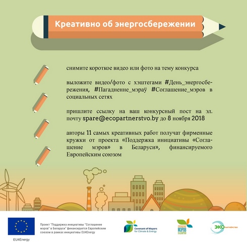 Авторы 11 самых креативных работ получат фирменные кружки от проекта «Поддержка инициативы «Соглашение мэров» в Беларуси», финансируемого Европейским союзом.