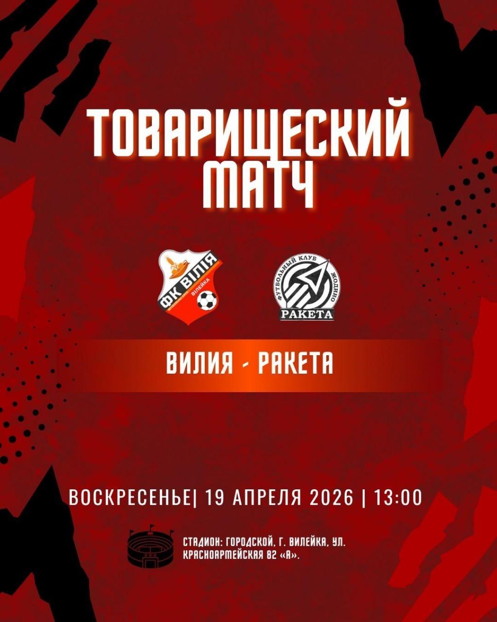 В воскресенье, 19 апреля в 13:00 на городском стадионе Вилейки (ул. Красноармейская, 2А) состоится товарищеский матч между командами «Вилия» и «Ракета». Приглашаются все желающие!