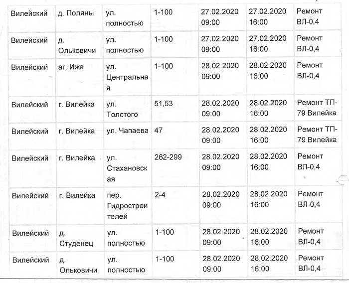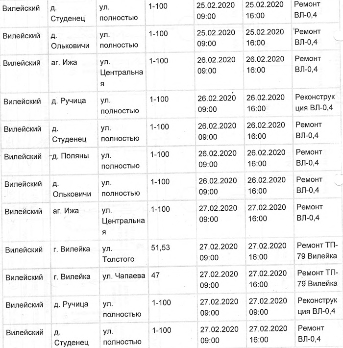 График отключения электричества в Вилейском районе с 25 по 28 февраля