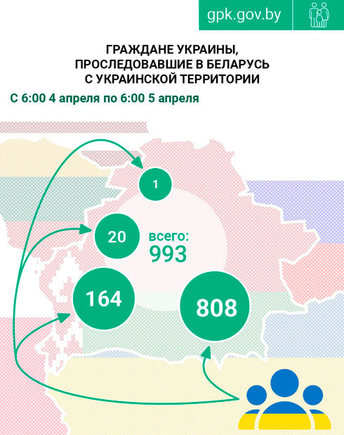 С 6:00 4 апреля по 6:00 5 апреля в нашу страну через украинско-белорусскую границу прибыло 808 граждан Украины, транзитом через Польшу — 164, через Литву — 20, через Латвию — 1.