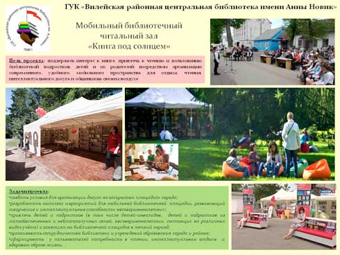 Чтобы поддержать интерес к книге, вилейские библиотекари решили создать передвижной библиотечный читальный зал «Книга под солнцем», в котором можно читать, смотреть фильмы, организовывать выставки и разнообразные литературные open-air, интеллектуальные соревнования и игры. На развитие проекта необходима крупная сумма.