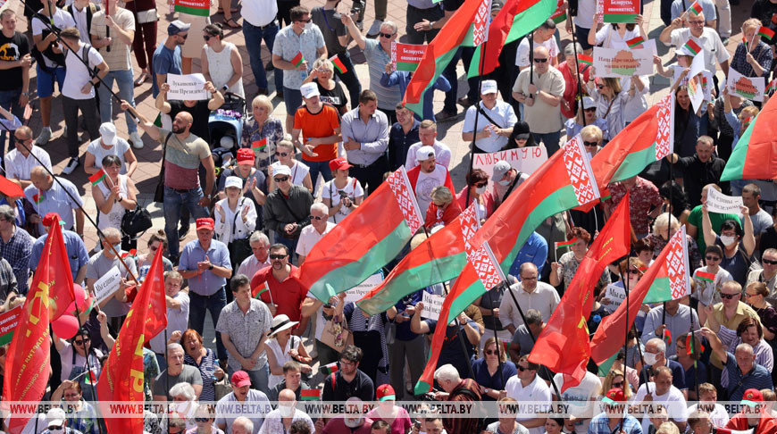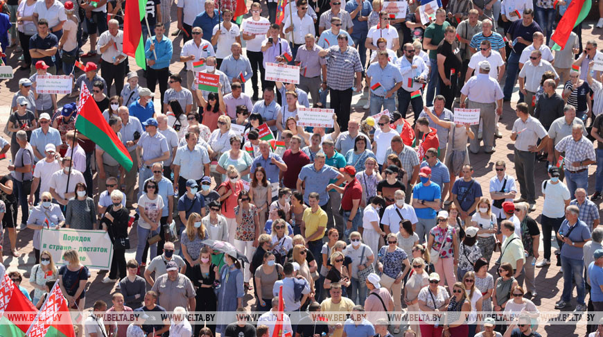 Как объявили накануне организаторы мероприятия, оно проходит в поддержку спокойствия, мира и безопасности в Беларуси. «Кто дорожит всем тем, что мы создали за время независимости! Кто выступает против развала страны! Все, кому дорога наша светлая и любимая Беларусь! Все — на митинг», — призвали они в субботу. Здесь видны флаги Министерства по чрезвычайным ситуациям, Федерации профсоюзов Беларуси, спортивного общества «Динамо», Коммунистической партии Беларуси. Люди скандируют: «Беларусь!» На митинг также приехали высшие должностные лица и руководители государственных органов, в том числе председатель Совета Республики Наталья Кочанова и глава Администрации Президента Игорь Сергеенко.
