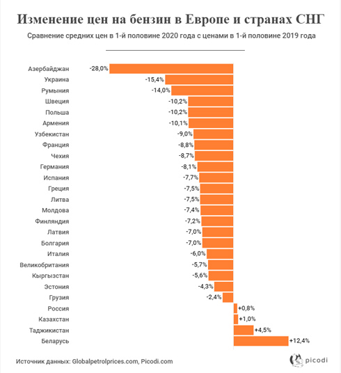 Аналитики собрали данные о стоимости бензина в первой половине года. В подавляющем большинстве стран Европы и СНГ цена на бензин в первом полугодии 2020 года в среднем была ниже, чем в 2019 году. Самое большое падение цен было зафиксировано в Азербайджане (−28 %), Украине (−15,4 %) и Румынии (−14 %).