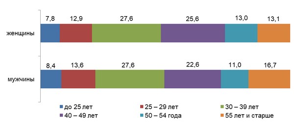 Средний возраст занятых в 2018 году составил 40,6 года. Максимальный уровень занятости наблюдается в возрастной группе от 30 до 34 лет (91,5%). Удельный вес молодежи в возрасте до 31 года составил 24,2%.
