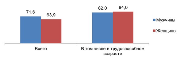 По данным выборочного обследования уровень занятости населения республики в прошлом году составил 67,5%, в том числе среди населения в трудоспособном возрасте – 83%.