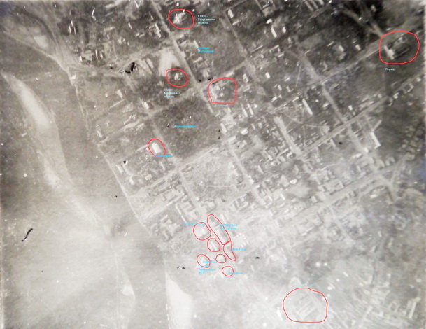Не менее интересна и аэрофотосъёмка Вилейки 1916 года, которая также есть в фотоальбоме. На ней можно различить многие здания, которые сохранились до наших дней, или установить точное месторасположение не дошедших до наших дней большой синагоги и Свято-Георгиевской церкви.