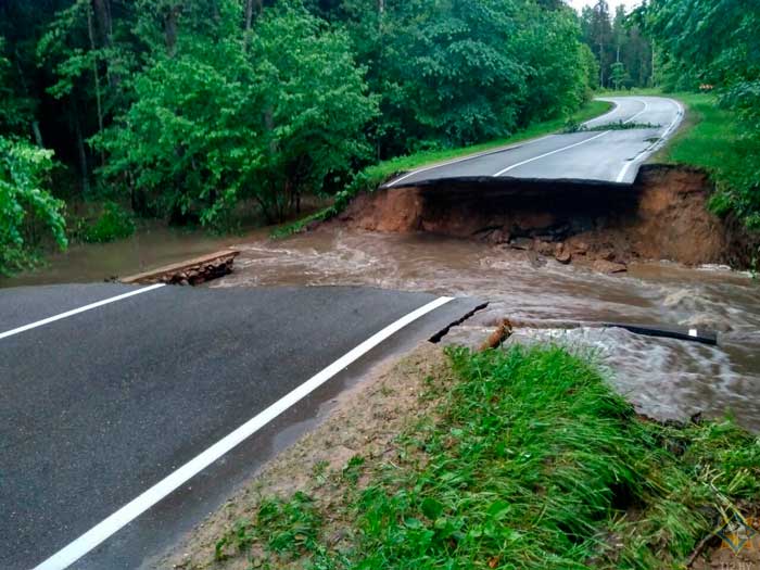 В результате выпадения осадков в виде дождя (с 15:00 до 18:00 выпало 18 мм при среднемесячной норме 64 мм) произошли подмывы грунта и разрушения участков (15х30 м) асфальтной дороги Р-54 между д. Першаи и д. Скрундевщина и (10х20 м) асфальтной дороги в д. Першаи Воложинского района. Пострадавших нет. Жизнеобеспечение населения не нарушено. Ведутся ремонтно-восстановительные работы.
