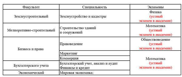 При поступлении на специальности направления образования «Сельское хозяйство» и «Рыбное хозяйство» абитуриенты сдают только 2 испытания в форме ЦТ или ЦЭ или в форме экзамена в академии.