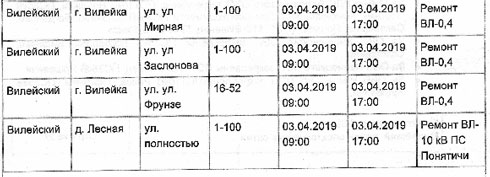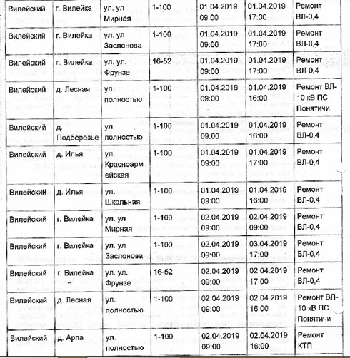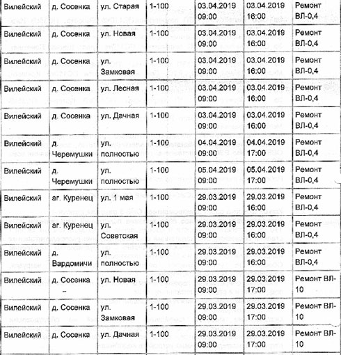 Перечень населенных пунктов Вилейского района, где планируются отключения электроэнергии в связи с ремонтами электрических сетей
