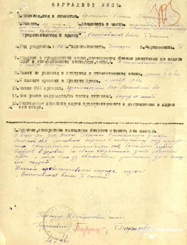 Степан Мартынович Ермоленко, уроженец деревни Выдренка Могилёвской области. Когда началась война, все парни и мужчины отправлялись служить, но все в разные места. Прадед сразу остался в своём районе, в 755 стрелковом полку 217 стрелковой дивизии. Был артиллеристом по профессии, все четыре года войны. Четыре года крови, потерь и мужества.