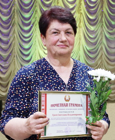 Працоўны шлях Святланы Гром адзначаны мноствам розных узнагарод. Наўрад ці пералічыш усе іх па памяці. З самых нядаўніх і ганаровых – знак «Отличник здравоохранения Республики Беларусь», якога урач удастоена чатыры гады таму назад. Што і казаць, высокая і заслужаная шматгадовай працай узнагарода.