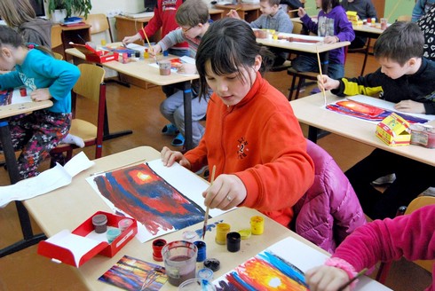 Тым часам з малодшымі школьнікамі ўрок жывапісу праводзіла выкладчык Вікторыя Рекуц. Пад яе чулым кіраўніцтвам малыя стваралі сапраўдныя яркія творы мастацтва. Неверагоднай прыгажосці закаты атрымліваліся на малюнках у дзяцей. Аказваецца, ствараць мастацкія шэдэўры так проста, галоўнае з пачуццём падысці да працэсу! А яшчэ з самымі маленькімі дзеткамі правяла майстар-клас «гульнятэка» Яўгенія Паляшчук. Якой радасцю свяціліся хлопчыкі і дзяўчынкі, калі ім у рукі далі новыя прыгожыя скрынкі з гульнямі. Незвычайныя развіваючыя гульні, цалкам новыя і цікавыя, для розных узростаў хутка зацікавілі і дзяцей, і дарослых. Дарэчы, у класах Яўгеніі з дзеткамі гулялі практычна ўсе валанцёры, якія прыехалі ў інтэрнат.