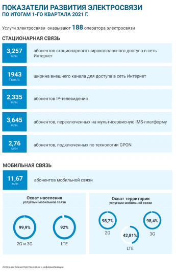 Охват населения и территории страны услугами сотовой подвижной электросвязи по технологии LTE увеличился и на 1 апреля 2021 года составил 92% и 42,8% соответственно.