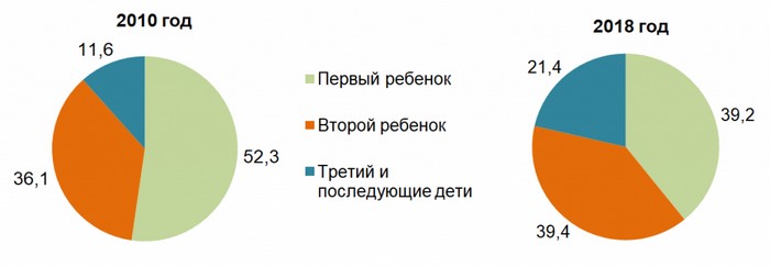 Растет число рождений у женщин в возрасте 40 – 44 лет. У матерей этой возрастной группы в 2018 году родилось 2247 детей, что в 1,8 раза больше, чем в 2010 году. 54% детей, рожденных у женщин в возрасте 40 – 44 лет, – третьи и последующие дети.